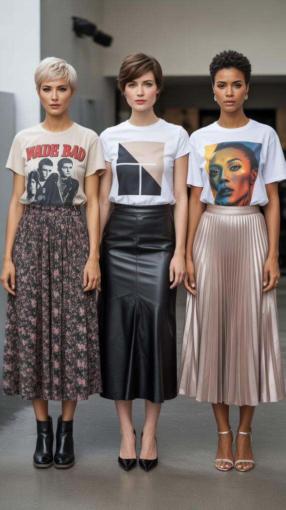 Pairing a casual graphic tee with a more formal midi skirt creates an intentionally contrasting look that feels fresh, youthful, and fashion-forward.