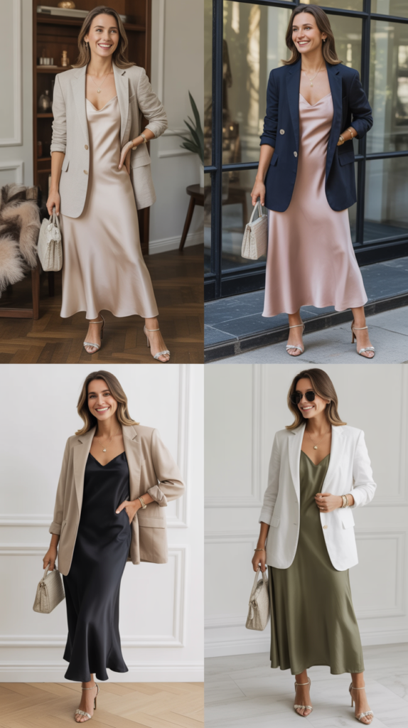 - Choose slip dresses in midi or knee-length for adequate coverage
