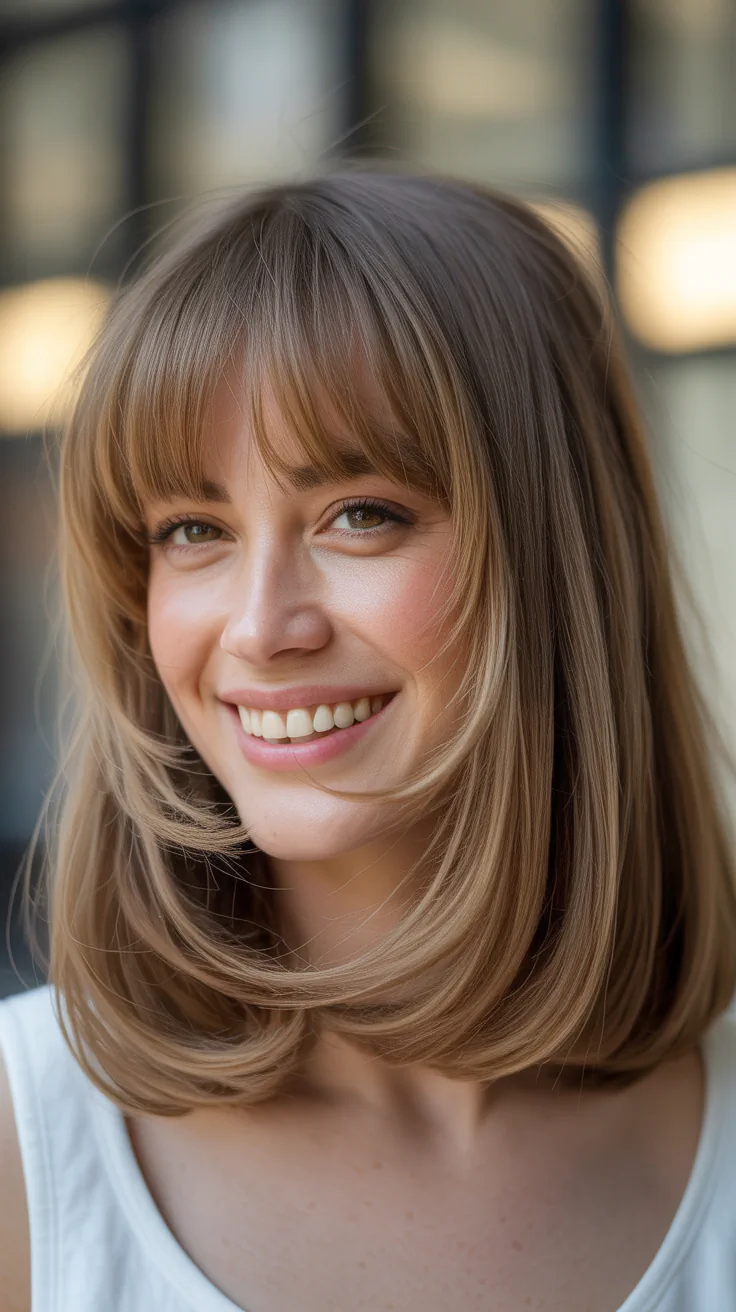 This bold variation features a strong, blunt baseline and substantial curtain bangs that make a definitive style statement while providing maximum face-framing benefits.