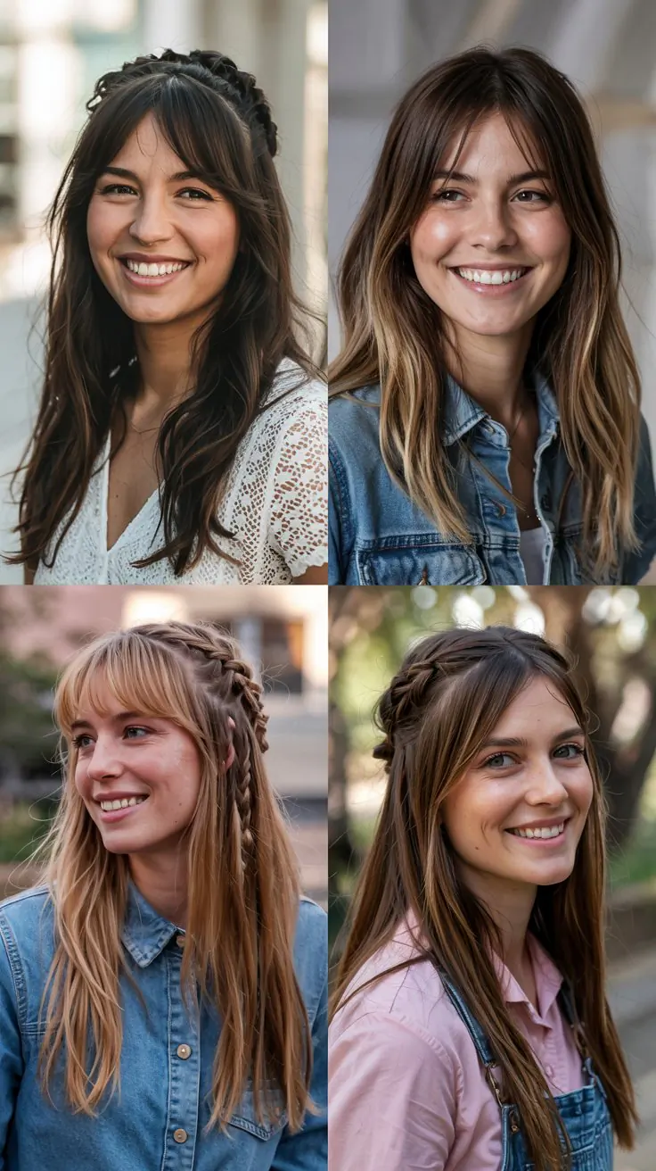 - The side bangs frame the face naturally and provide softness that balances the textured braided crown, preventing the style from pulling all attention away from facial features.